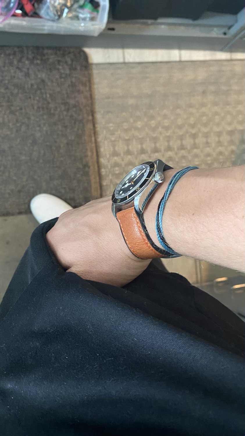 Waterproof BLACK Leather Strap Rubber Bottom BLUE Stitch