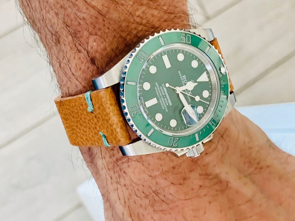 Light Brown Horween Leather Racing watch strap GREEN Stitch