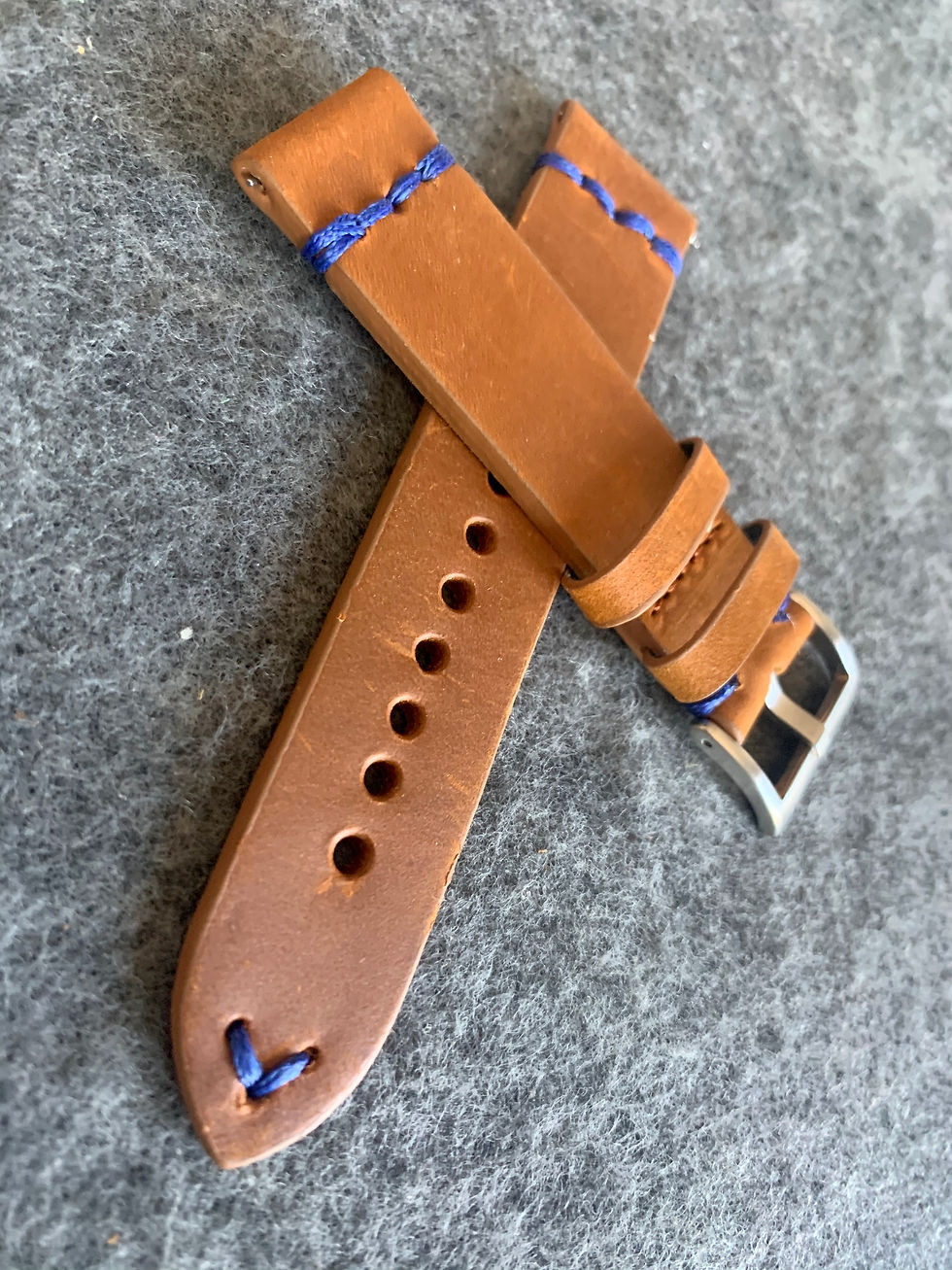 BROWN, Thick, Crazy Horse Leather watch strap - BLUE Stitching