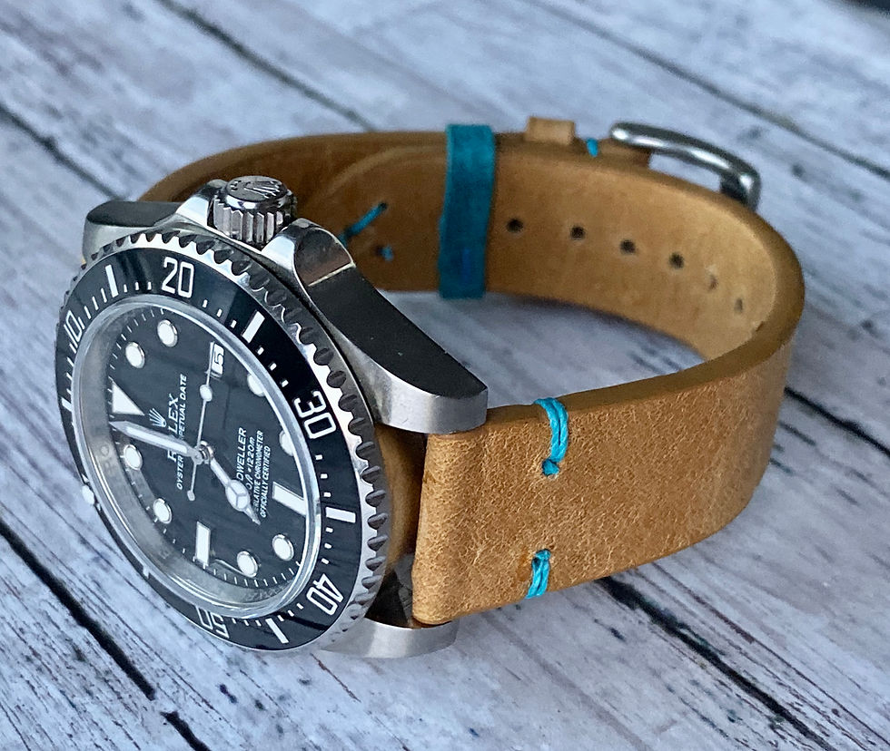 TAN Crazy Horse Leather Watch strap Thin AQUA Stitching